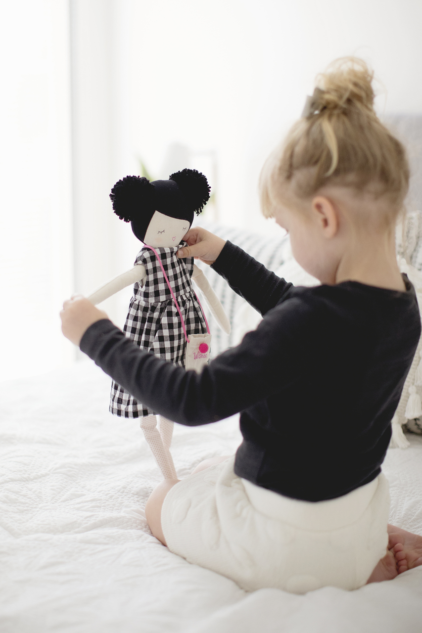 In StockSo pretty is our Dani doll in her black gingham cotton dress, handbag with her pom pom hair 50cm tall . Sure to be a favorite. Suitable from 3 years