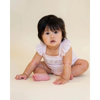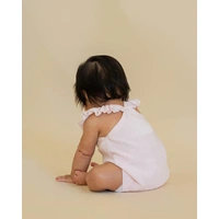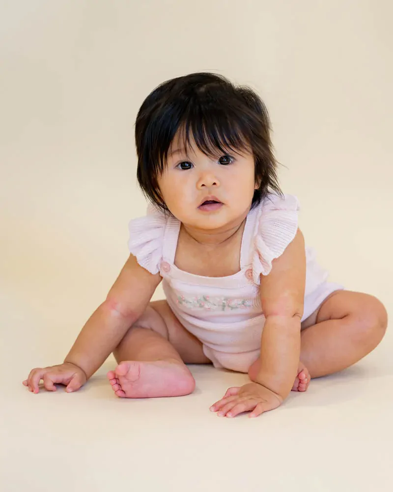 In StockA sweet summer staple with vintage charm, this knitted romper is made for sunshine days and picture-perfect moments. Featuring fluttery shoulder frills and delicate hand embroidery across the chest, it's a beautifully crafted piece designed for comfort, style, and a touch of whimsy. Perfect for special outings or sunny playdates, layered with a bodysuit or worn on its own.