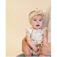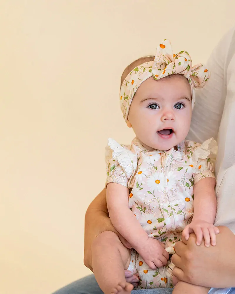 In StockFull of sunshine and sweet vintage charm, the Tess short sleeve zipsuit is made for play, cuddles and everything in between. Crafted from a soft and comfy cotton elastane blend in a delicate daisy print, it features fluttery broderie anglaise sleeves and gentle gathers at the leg. A concealed zip front makes changes quick and easy - perfect for busy little days. Match it back with the Tess headband for a cute matching outfit and gift.