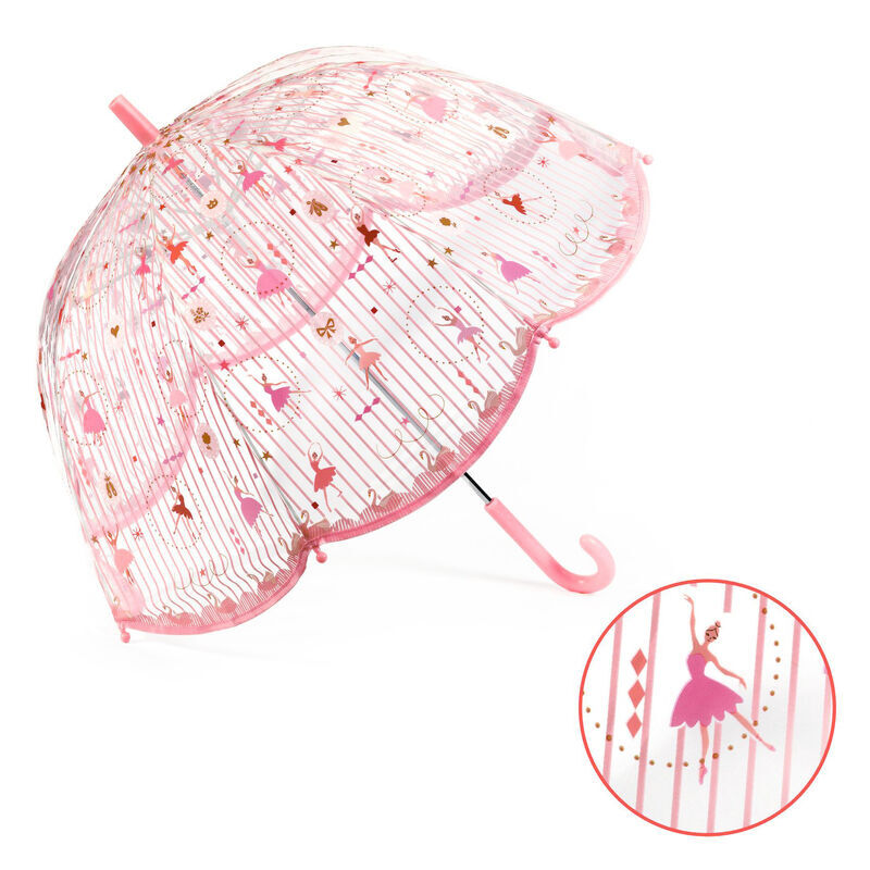 In StockA chic and practical umbrella with ballet dancer illustrations. Its transparent design enables the child to see where they are going, and its manual opening fitted with a protection system means that it can be opened and closed without pinching the childs fingers. A colourful accessory, ideal for brightening up outings in the rain!Dimensions when open: 68 x 70 cm diameter.