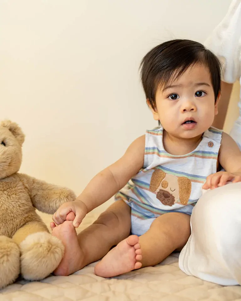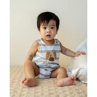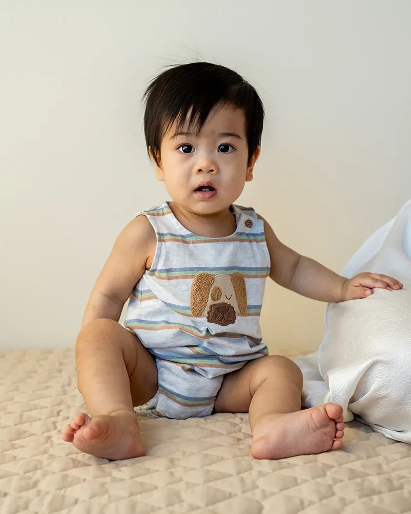 In StockA playful pup for sunny day adventures. This striped romper is soft, sweet and full of fun, with an adorable tufted dog embroidery and soft pastel hues. Perfect for playtime or outings with mum and dad, it's designed for comfort and ease with simple fastenings and a relaxed fit.