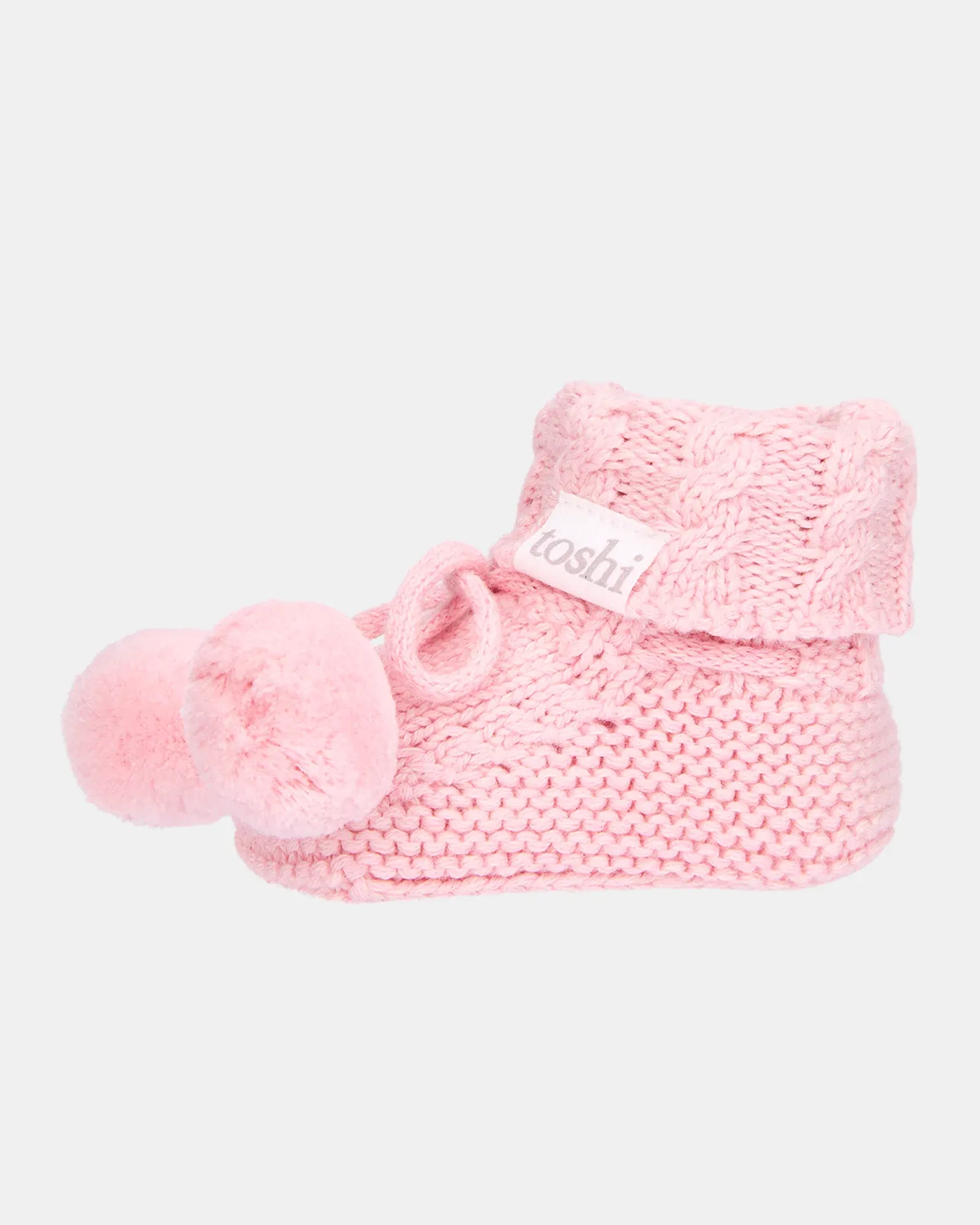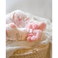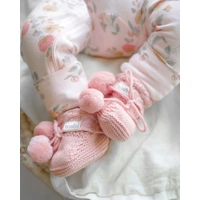 Organic Booties Yummy Misty Rose bring a handcrafted feel with beautifully textured melange knit in a soft pink shade. Classic cable knit and playful pom poms add artisanal charm and warmth, designed in Australia for grown ups who love cozy style.