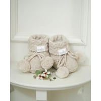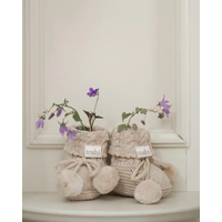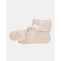 Organic Booties Yummy Oatmeal bring adventure-ready style with a beautifully textured melange knit in a warm beige. Chunky cable knit and playful pom poms deliver bold, handcrafted energy for active families.