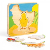 Lift each puzzle layer to reveal a new lifecycle stage. Llittle hands can piece together the evolution of an egg, to a chick, to an adult chicken. Features four lift-out jigsaw puzzle layers. Wooden puzzles help develop fine motor skills and language development.